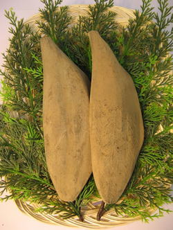 | 小さめのサバを、1匹のまま加工してカビ付けを行ったサバ節で、枯丸サバ節と呼ばれます。 | サバ節を2枚に割りカビ付けを行ったもので、枯割サバ節と呼ばれます。 | |||